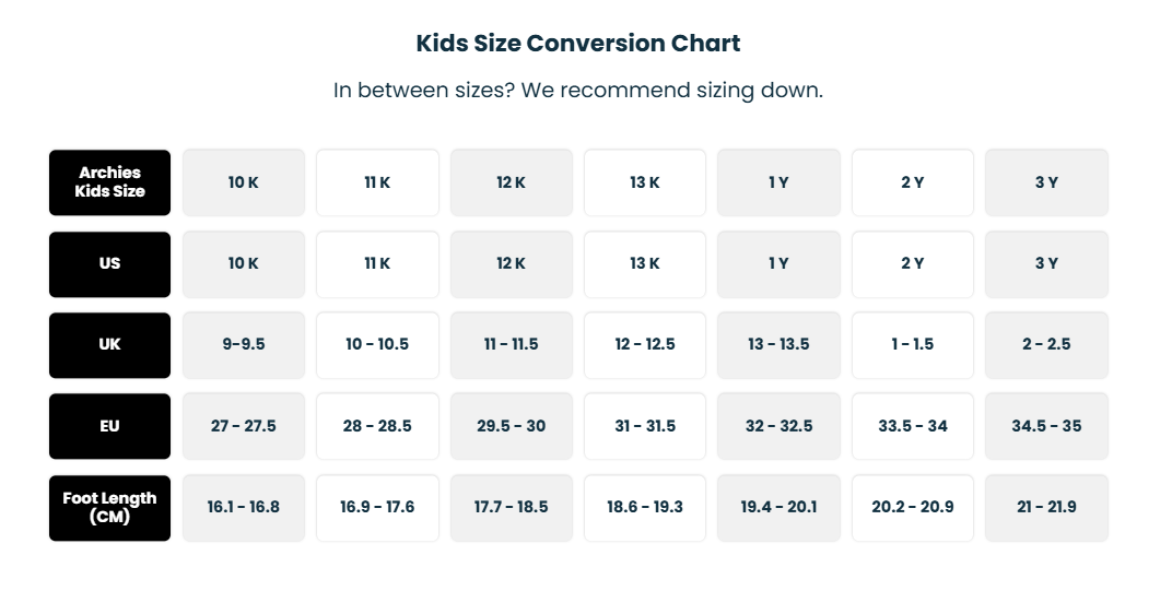 When ordering a pair of Archies Thongs, we recommend you choose your normal running shoe size and check the size chart for foot length (cm).